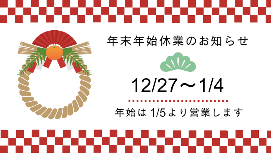 平素から格別なお引き立てを賜り厚く御礼申し上げます。 下記のとおり弊社の年末年始の休業期間についてご連絡させていただきます。 【年末年始の営業スケジュール】 休業期間:2025年12月27日(土)~2026年1月4日(日) ※2026年1月5日(月)より、通常どおり営業を開始します。 12月26日(金)午後から休業期間中にお寄せいただいたお問い合わせには営業開始後に順次対応いたします。 予めご了承くださるようお願いいたします。